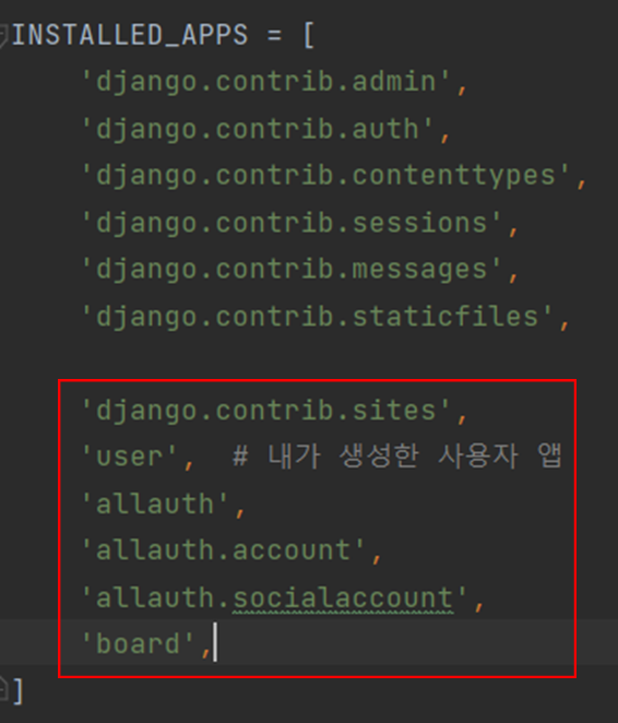 3. settings.py의 INSTALLED APP에 다음을 추가한다.