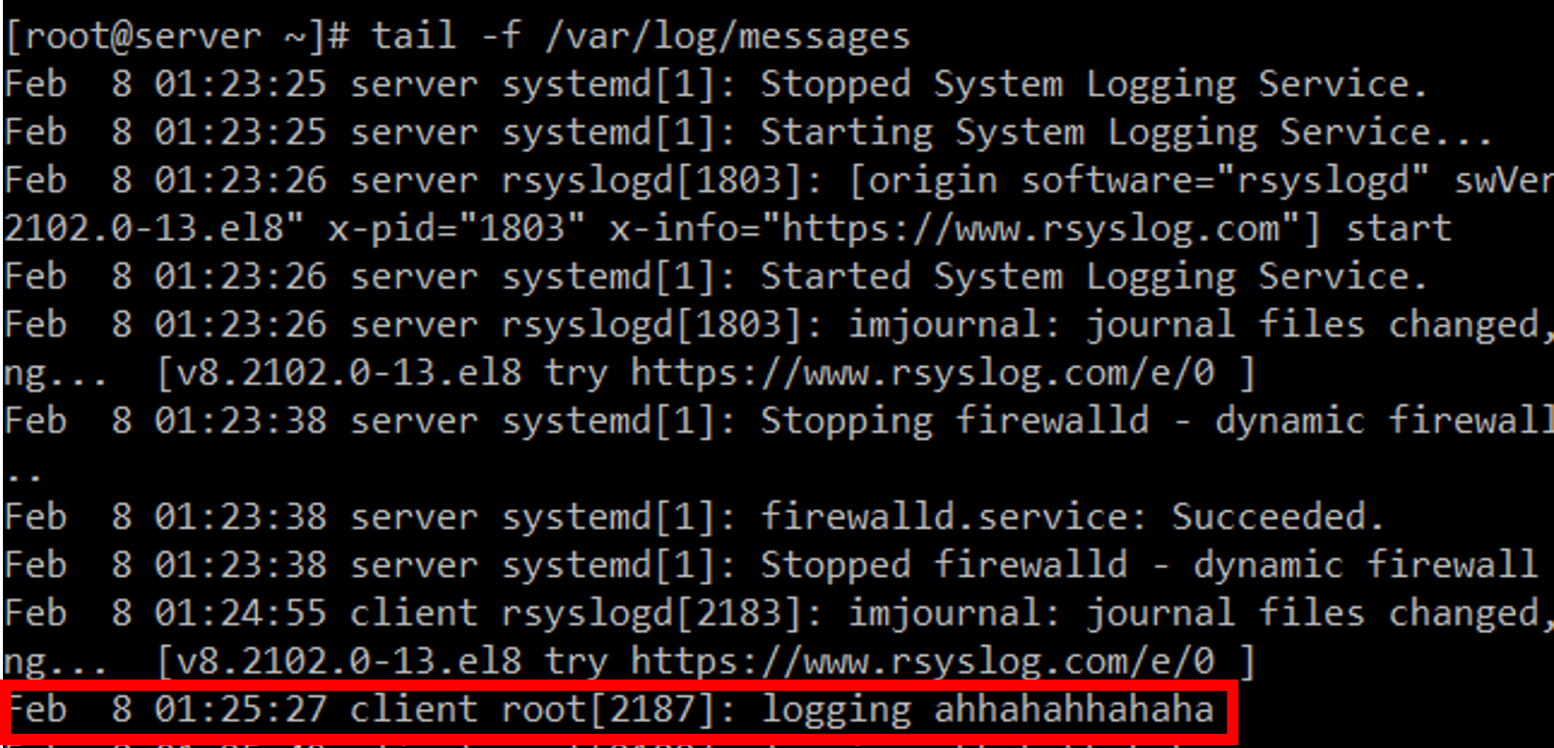 2. 서버) tail -f /var/log/messages 명령어를 통해서 로그를 확인한다. 로그를 실시간으로 확인할 수 있다.
