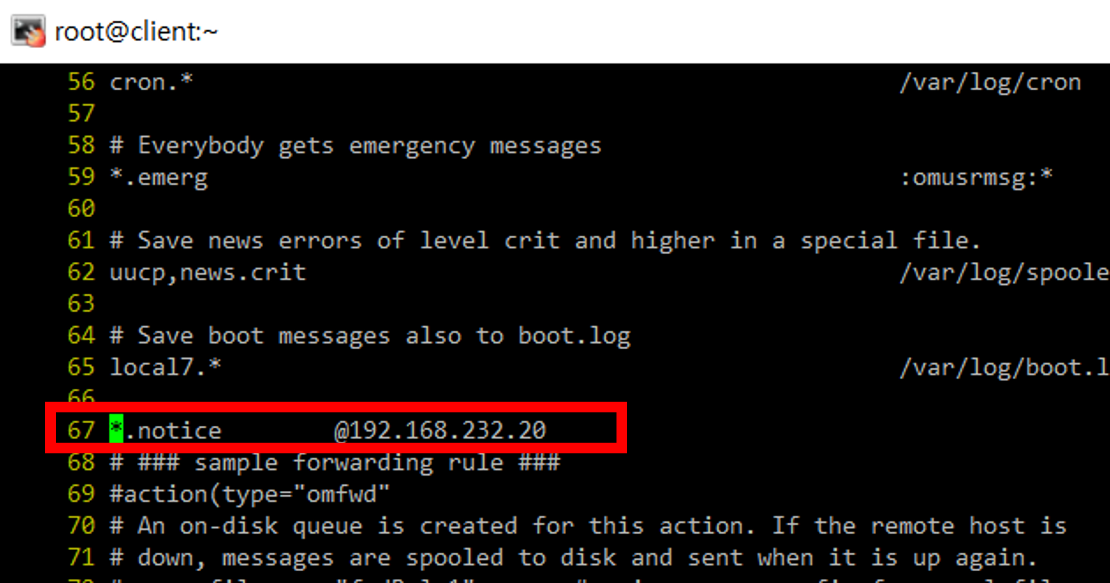 2. 클라이언트) vi 편집기에서 67번 라인에 *.notice @[서버 IP] 를 추가한다.