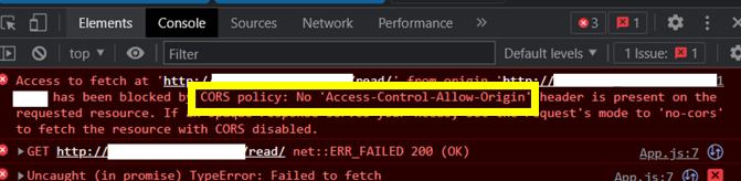 그러면 해당 페이지에서 <f12>를 눌렀을 때 다음과 같이 'CORS policy' 오류가 뜨는 것을 확인할 수 있다.
