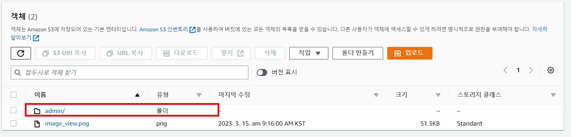 6. AWS S3) S3 버킷에 들어가보면 다음과 같이 admin폴더가 생성된 것을 확인할 수 있다.